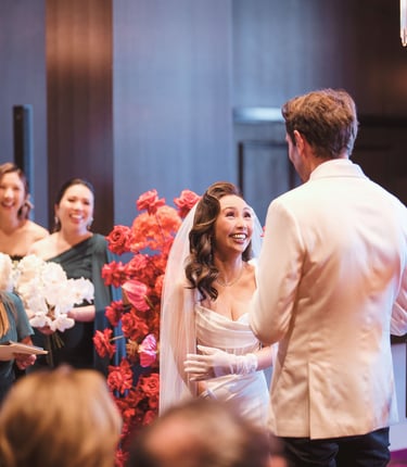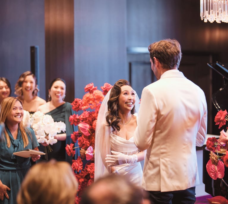Celebrate Liann & Quentin’s wedding set against vibrant red and green hues in a cozy, charming venue.